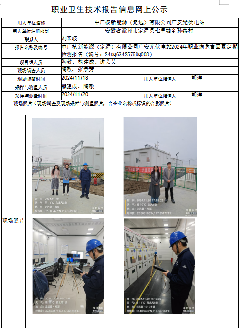 中廣核新能源(定遠)有限公司廣安光伏電站2024年職業病危害因素定期檢測報告(編號:24DQ63425758Q008)