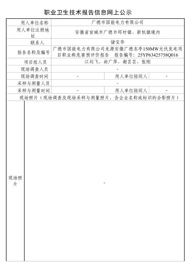 廣德市國能電力有限公司龍源安徽廣德東亭150MW光伏發電項目 職業病危害預評價報告 報告編號:25YP63425758Q016