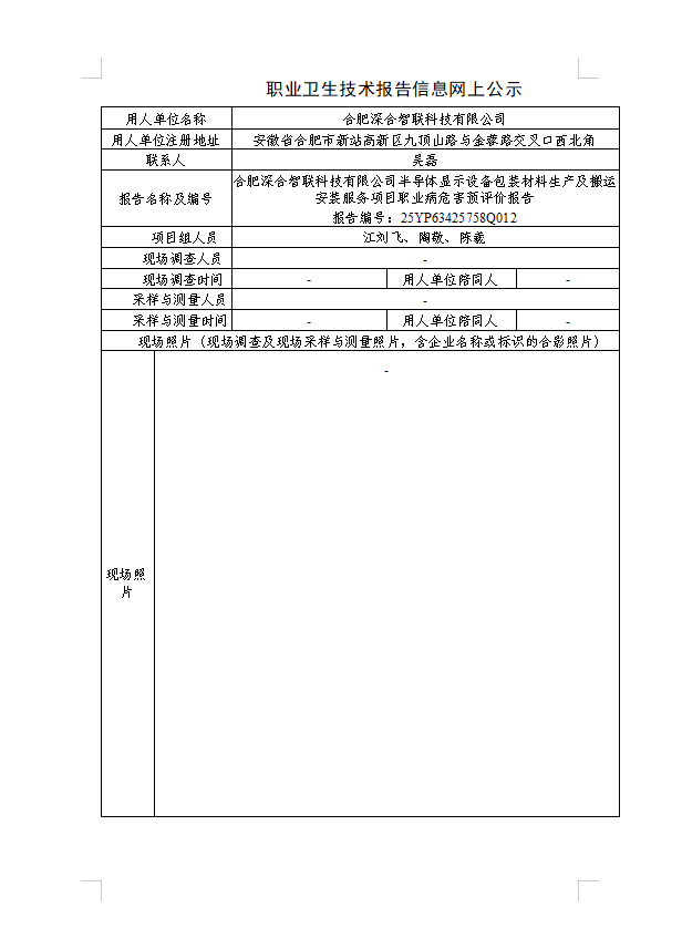 合肥深合智聯(lián)科技有限公司半導(dǎo)體顯示設(shè)備包裝材料生產(chǎn)及搬運(yùn)安裝服務(wù)項(xiàng)目職業(yè)病危害預(yù)評(píng)價(jià)報(bào)告 報(bào)告編號(hào):25YP63425758Q012