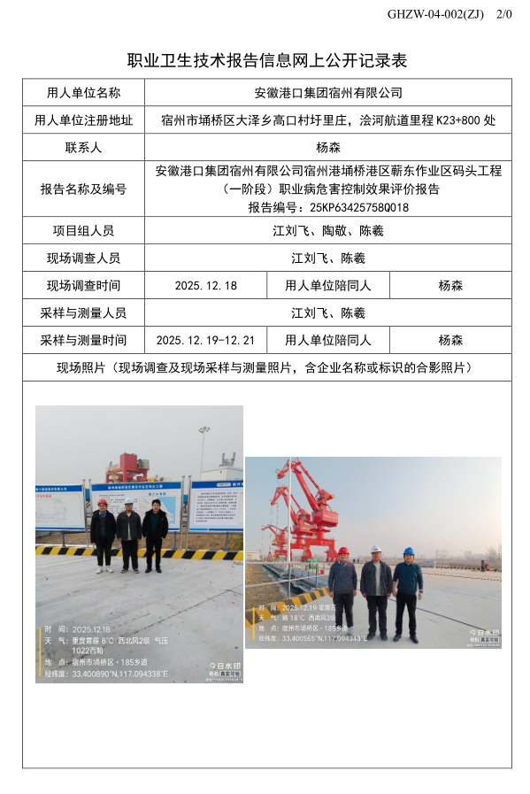 安徽港口集團宿州有限公司宿州港埇橋港區蘄東作業區碼頭工程(一階段)職業病危害控制效果評價報告 報告編號:25KP63425758Q018