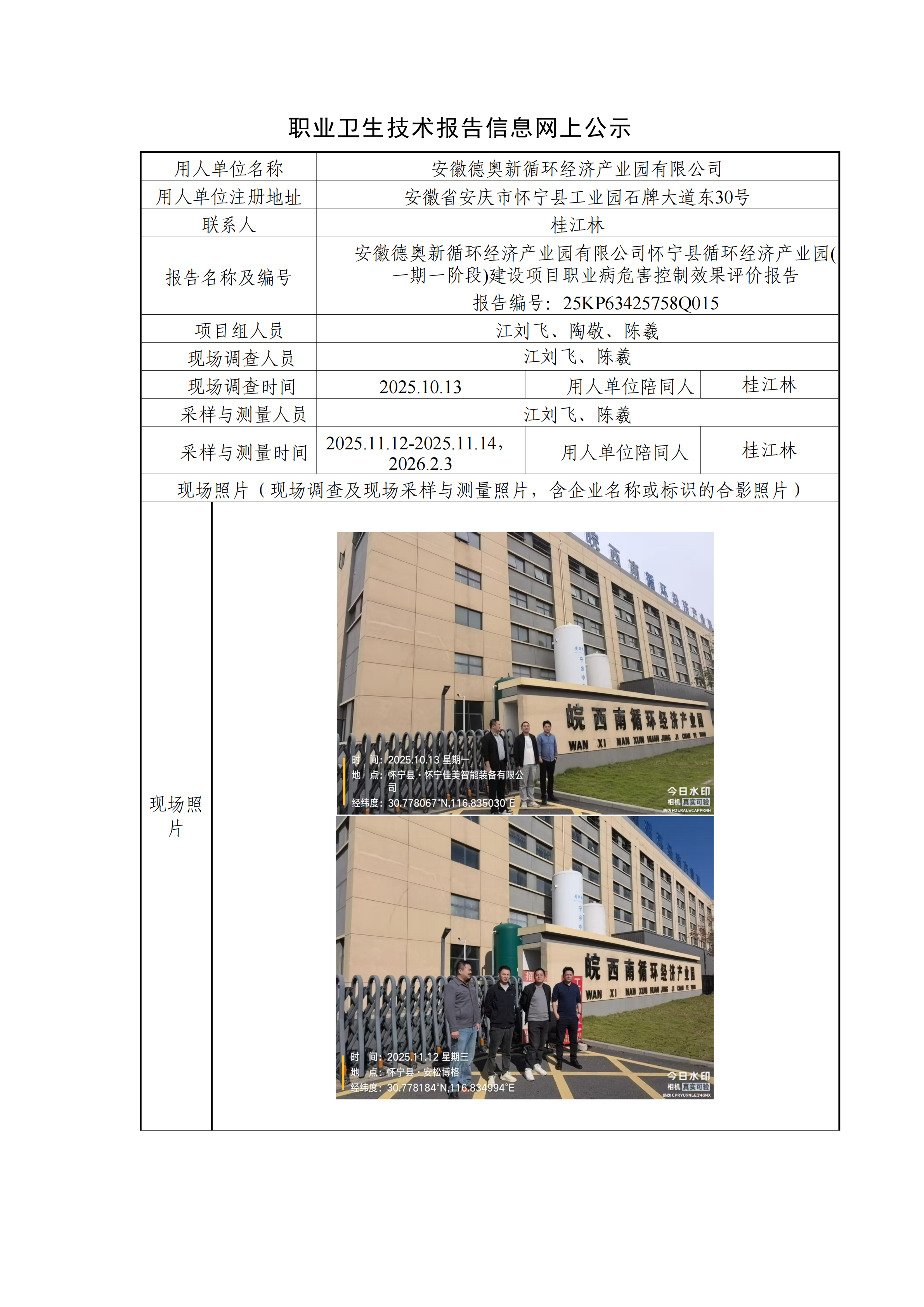 安徽德奧新循環經濟產業園有限公司懷寧縣循環經濟產業園(一期一階段)建設項目職業病危害控制效果評價報告 報告編號:25KP63425758Q015