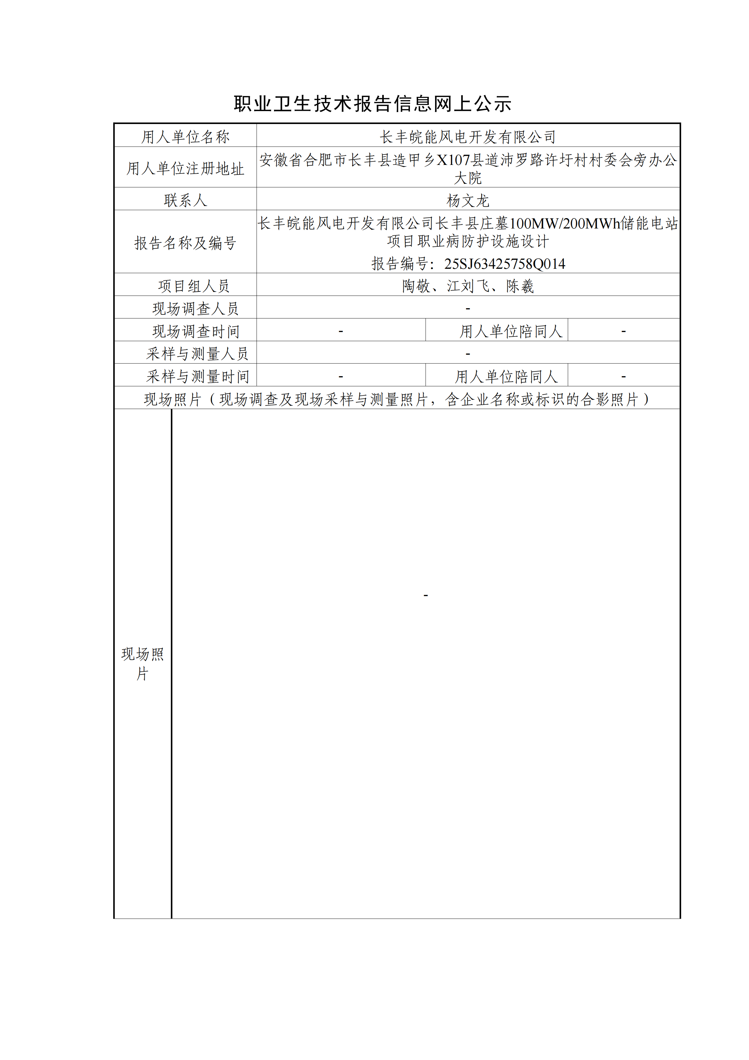 長豐皖能風電開發有限公司長豐縣莊墓100MW/200MWh儲能電站項目職業病防護設施設計 報告編號:25SJ63425758Q014